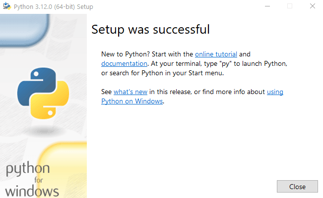 A este punto la instalación habrá finalizado, simplemente dale a Close, para confirmar la correcta instalación de Python vamos a corroborarlo, abre la línea de comandos o CMD. y ejecuta python3 --versión o en su defecto, simplemente escribe python –-version y si se instalo correctamente te debería aparecer así: