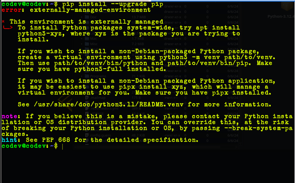 Esto se debe a que el sistema o distribución que estás utilizando gestiona la instalación de paquetes por sí mismo, generalmente esto ocurre en distribuciones basadas en Debian y si es tu caso, esta es la razón de esa salida en la terminal, pero tranquilo, ya que esto ocurre por seguridad y estabilidad del propio sistema, ya que por medio de la gestión mediante pip se pueden instalar muchos paquetes que de cierta forma podrían afectar el buen funcionamiento del sistema operativo.